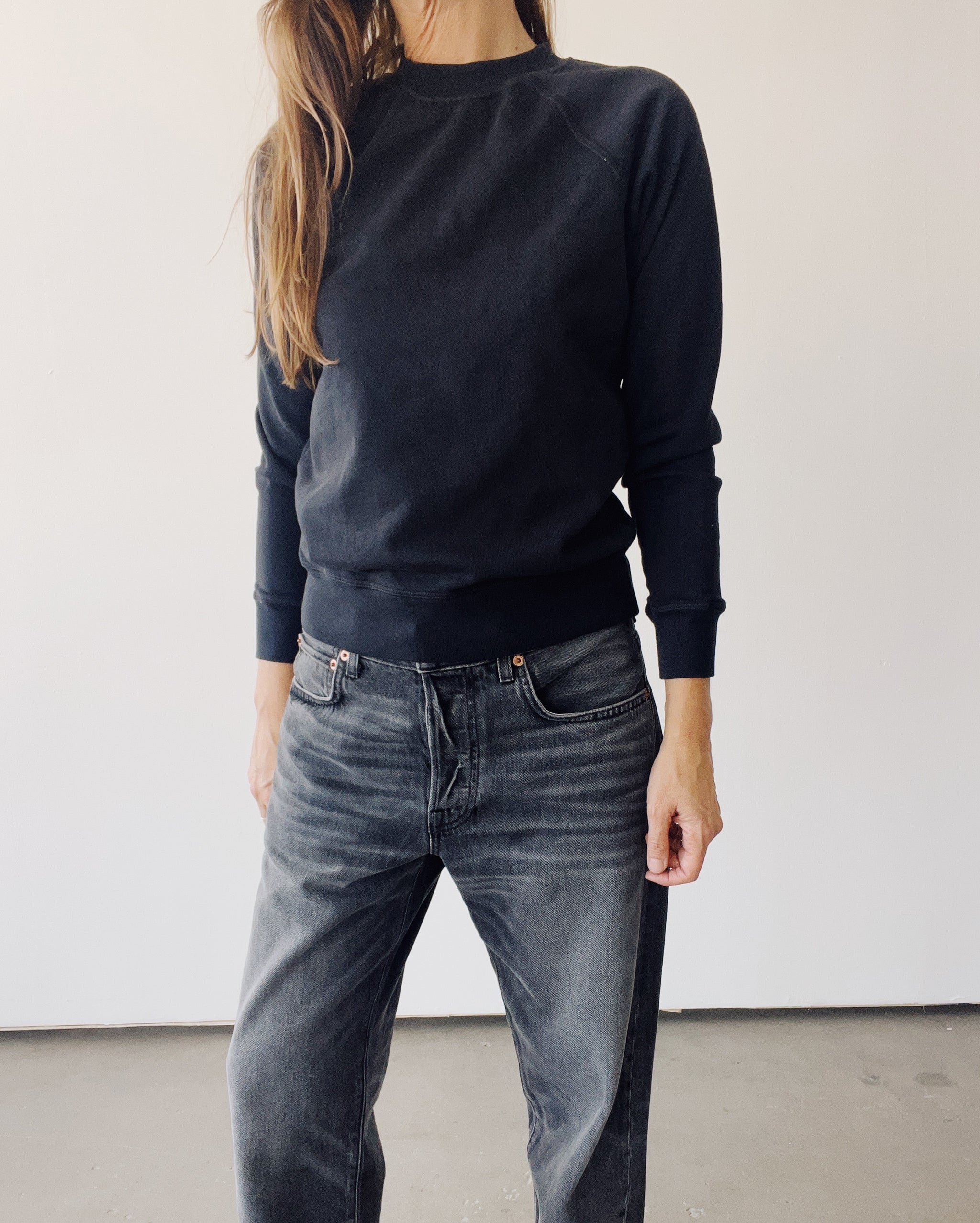 Our classic sweatshirt in Vintage Black. Super cozy lightweight fleece. Pigment dyed. A perfect staple for your wardrobe. Fit is slightly shrunken and based off a vintage sweatshirt