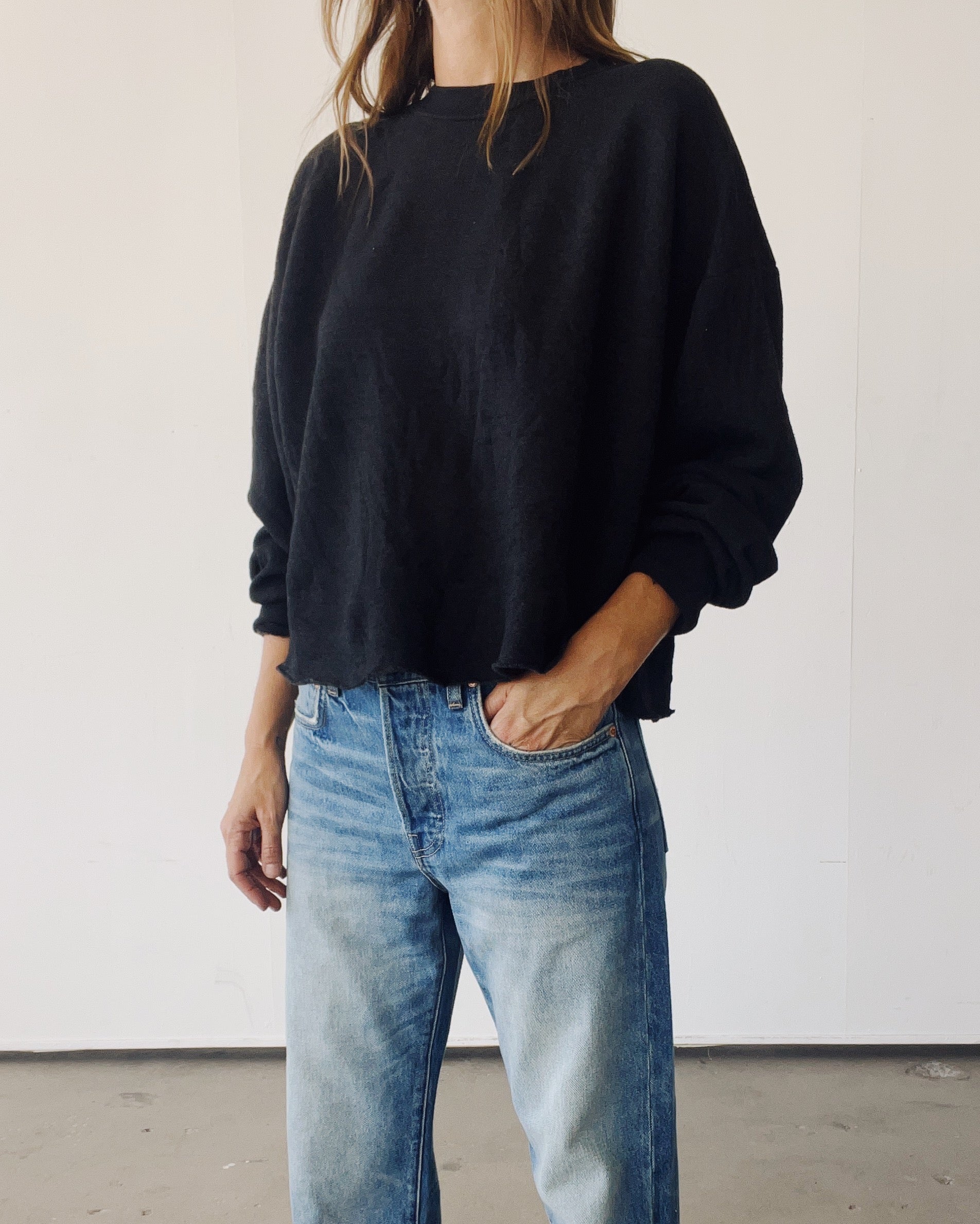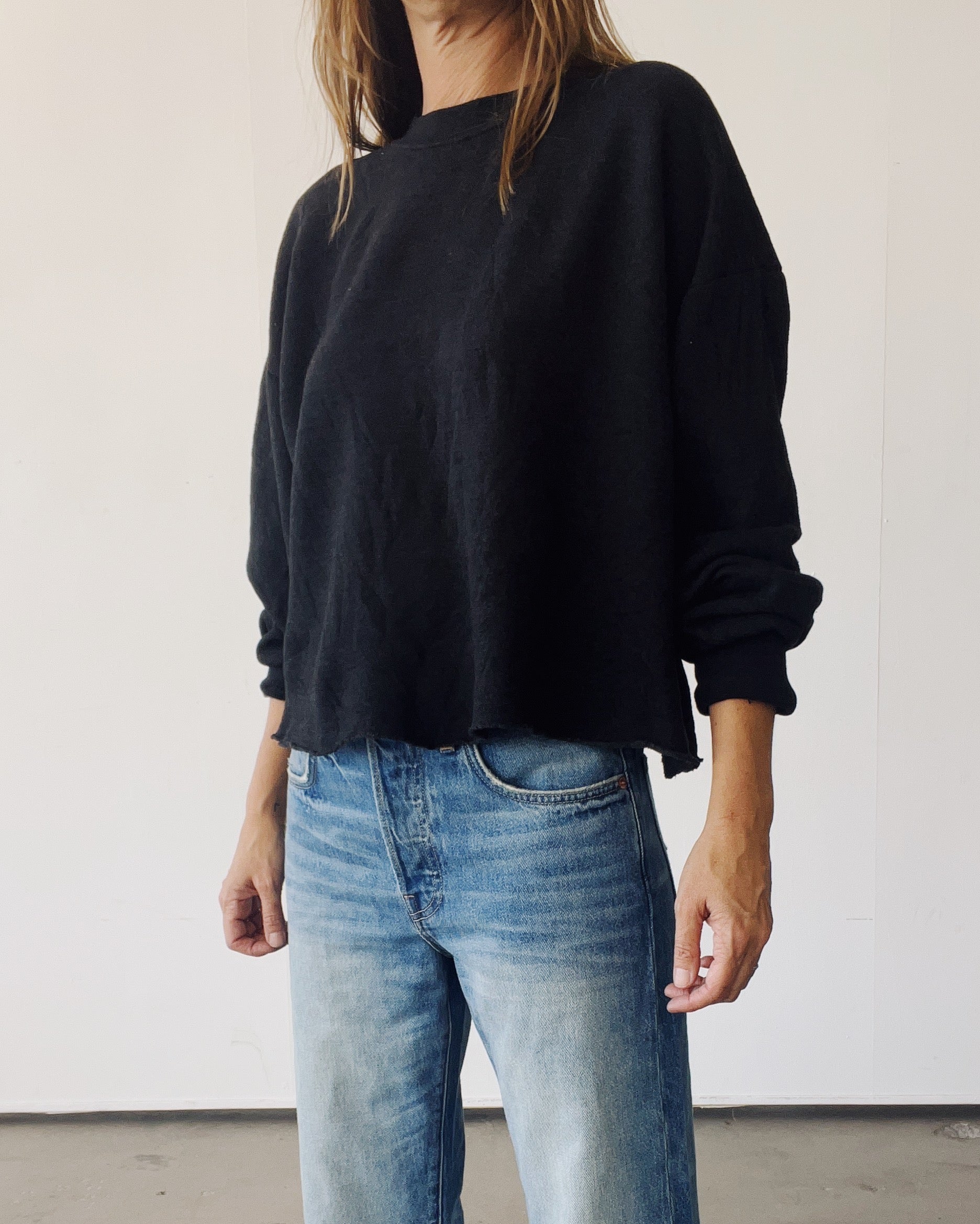 The Boxy crop is our newest knit style. It's an oversized sweatshirt cropped with a raw hem. Made with our super cozy tri-blend fleece, garment dyed, and enzyme washed for a vintage feel.